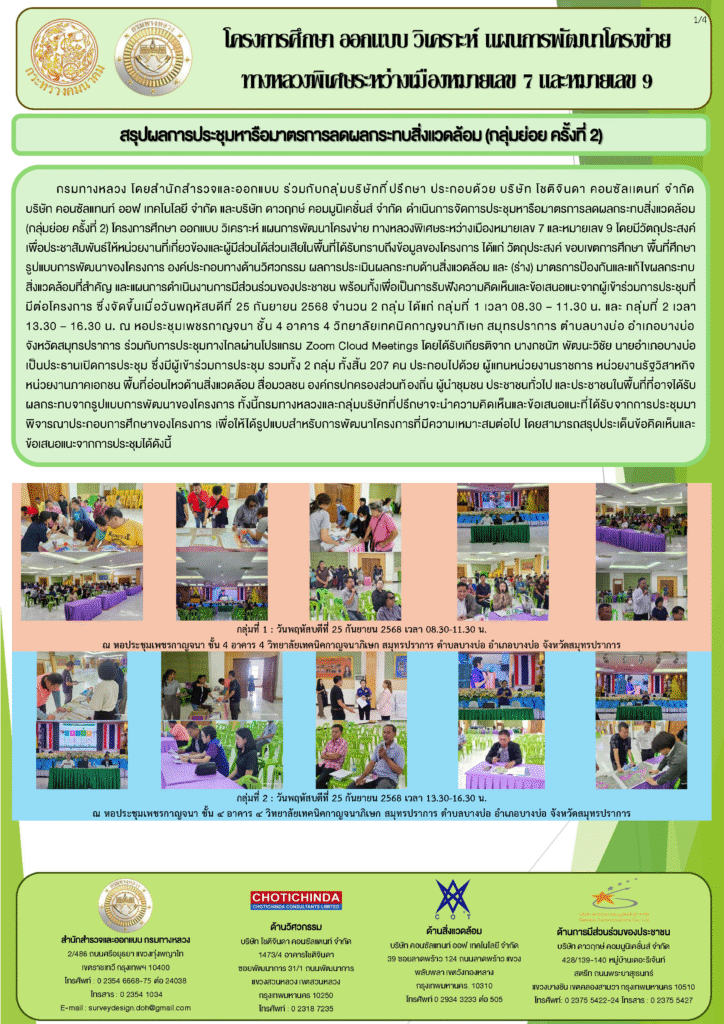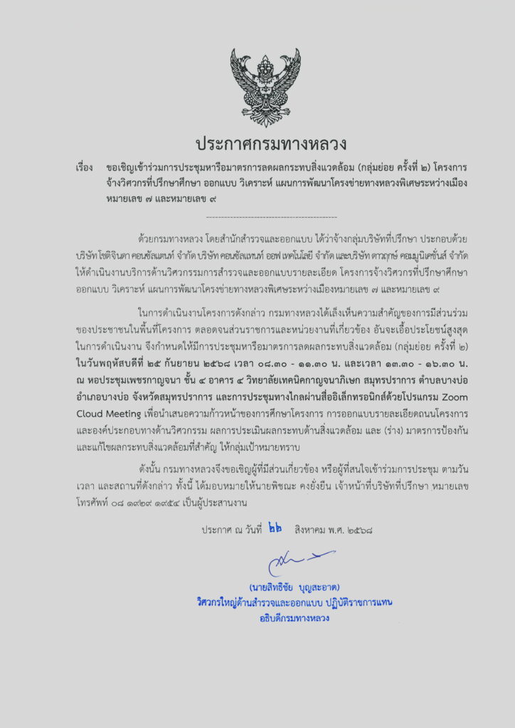 ประกาศกรมทางหลวง เรื่อง ขอเชิญชวนเข้าร่วมการประชุมหารือมาตรการลดผลกระทบสิ่งแวดล้อม (กลุ่มย่อย ครั้งที่ 2)