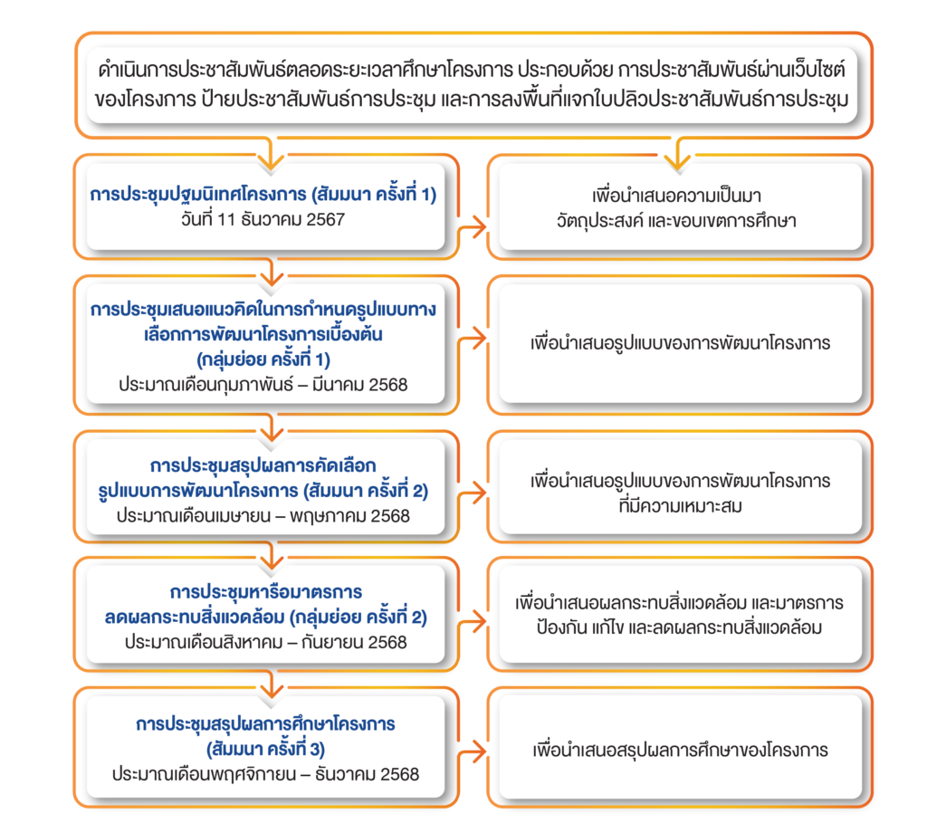 ที่ปรึกษาได้วางแผนการดำเนินงานการมีส่วนร่วมของประชาชนไว้อย่างต่อเนื่องตั้งแต่ระยะเริ่มต้นจนสิ้นสุดการศึกษาโครงการ โดยมุ่งเน้นการเผยแพร่ข้อมูลข่าวสารแก่กลุ่มเป้าหมายอย่างชัดเจนและมีความโปร่งใส เพื่อให้กลุ่มเป้าหมายมีโอกาสรับทราบข้อมูลความคืบหน้าของโครงการ และเปิดโอกาสให้มีการรับฟังความคิดเห็นให้ข้อเสนอแนะได้ในทุกขั้นตอนการศึกษาโครงการ ดังแสดงในรูปที่ 1 รายละเอียดดังต่อไปนี้