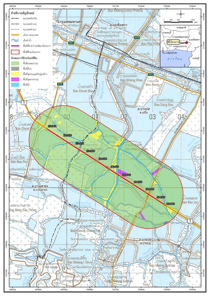 ผลการตรวจสอบการใช้ประโยชน์ที่ดินเบื้องต้น ตามประกาศกฎกระทรวงให้ใช้บังคับผังเมืองรวมจังหวัดสมุทรปราการ พ.ศ. 2556 บริเวณพื้นที่โครงการตั้งอยู่ในที่ดิน 3 ประเภท คือ บริเวณเขตสีเขียว หมายถึง ที่ดินประเภทชนบทและเกษตรกรรม บริเวณเขตสีเม็ดมะปราง หมายถึง ที่ดินประเภทคลังสินค้า และบริเวณเขตสีเหลือง หมายถึง ที่ดินประเภทที่อยู่อาศัยหนาแน่นน้อย แสดงดังรูปที่ 1 และเมื่อดำเนินการตรวจสอบข้อห้ามการใช้ประโยชน์ที่ดินตามประเภทข้างต้น พบว่า การพัฒนาโครงการเป็นการใช้ที่ดินเพื่อเป็นโครงข่ายคมนาคม ไม่ถูกระบุเป็นข้อห้ามต่อการใช้ประโยชน์ แต่อย่างไรก็ตาม ที่ปรึกษาจะดำเนินการตรวจสอบกับสำนักงานโยธาธิการและผังเมืองจังหวัดสมุทรปราการต่อไป