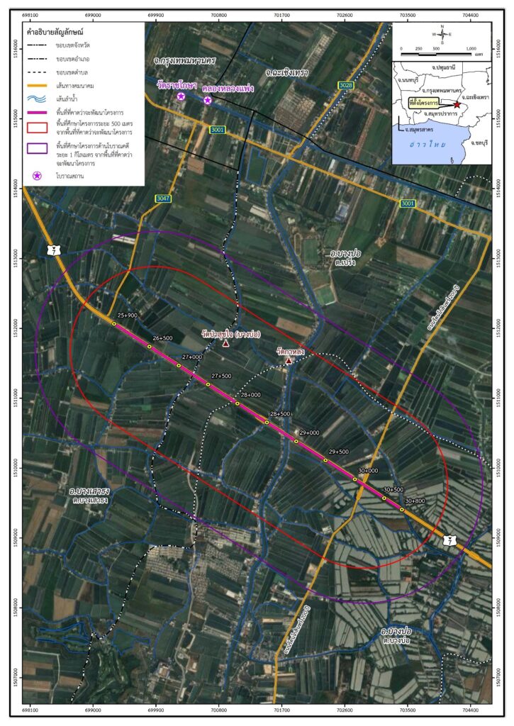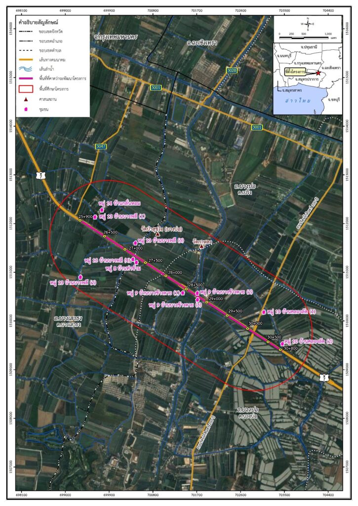 ผลการตรวจสอบข้อมูลพื้นที่อ่อนไหวต่อการได้รับผลกระทบจากการพัฒนาโครงการ ได้แก่ สถานศึกษา สถานพยาบาล ศาสนสถาน โดยทำการซ้อนทับแนวเส้นทางโครงการกับฐานระบบข้อมูลสารสนเทศภูมิศาสตร์ พื้นที่ศึกษาโครงการ พบว่า มีพื้นที่อ่อนไหวที่คาดว่าจะได้รับจากการพัฒนาโครงการ จำนวน 13 แห่ง ได้แก่ พื้นที่ชุมชนวัดป่าสุขใจ (บางบ่อ) และวัดกาหลง รายละเอียดแสดงดังตารางที่ 3 และรูปที่ 5