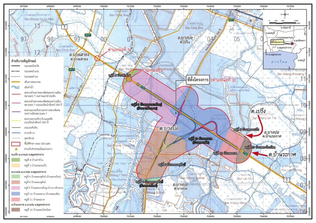 โครงการงานศึกษา ออกแบบ วิเคราะห์ แผนการพัฒนาโครงข่าย ทางหลวงพิเศษระหว่างเมืองหมายเลข 7และหมายเลข 9 พื้นที่ที่คาดว่าจะพัฒนาโครงการตั้งอยู่บริเวณทางหลวงพิเศษระหว่างเมืองหมายเลข 7 ประมาณกิโลเมตรที่ 25+900 ถึง กิโลเมตรที่ 30+800 ครอบคลุมพื้นที่ 1 จังหวัด 2 อำเภอ 3 ตำบล ได้แก่ บริเวณพื้นที่ตำบลบางเสาธง อำเภอบางเสาธง ตำบลเปร็งและตำบลบางบ่อ อำเภอบางบ่อ จังหวัดสมุทรปราการ รายละเอียดแสดงดังตารางที่ 1 และรูปที่ 1